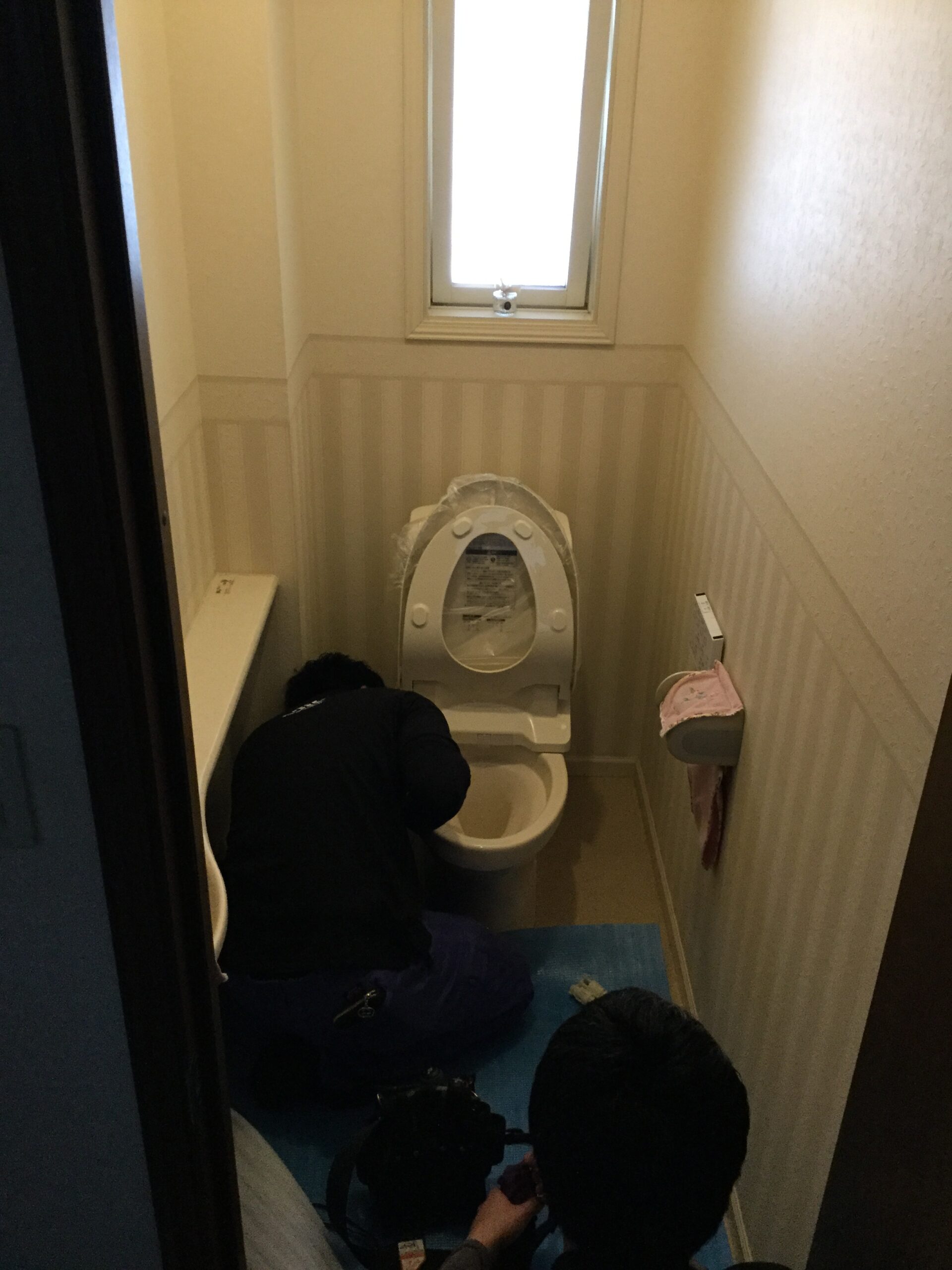 下の写真は、先輩に教えてもらいながら、トイレ交換しています。
