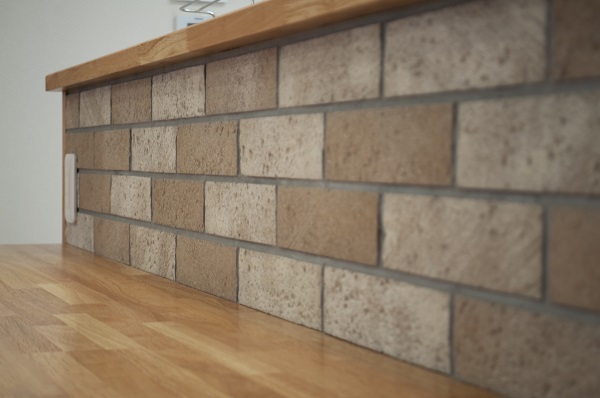 キッチンカウンターには奥様こだわりのレンガ調タイルがはめ込まれており、