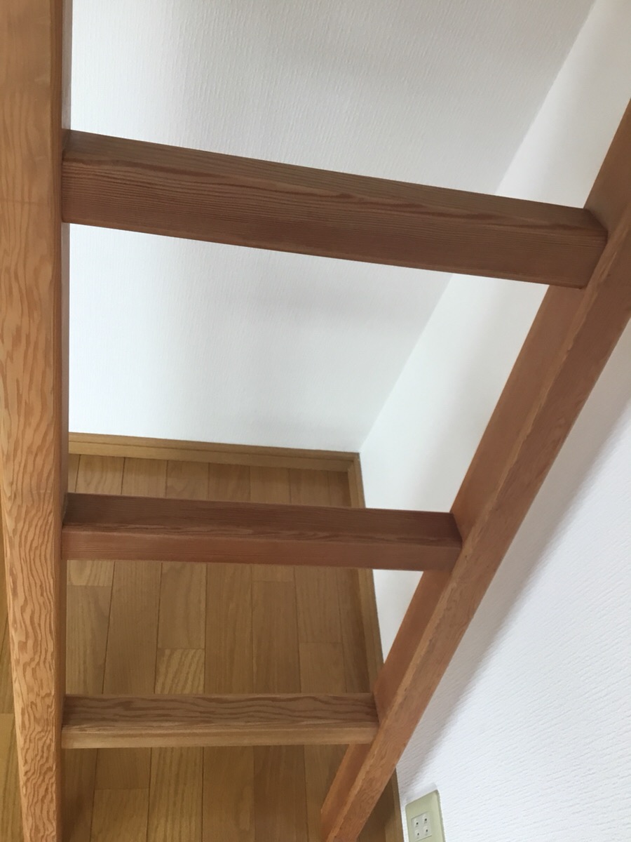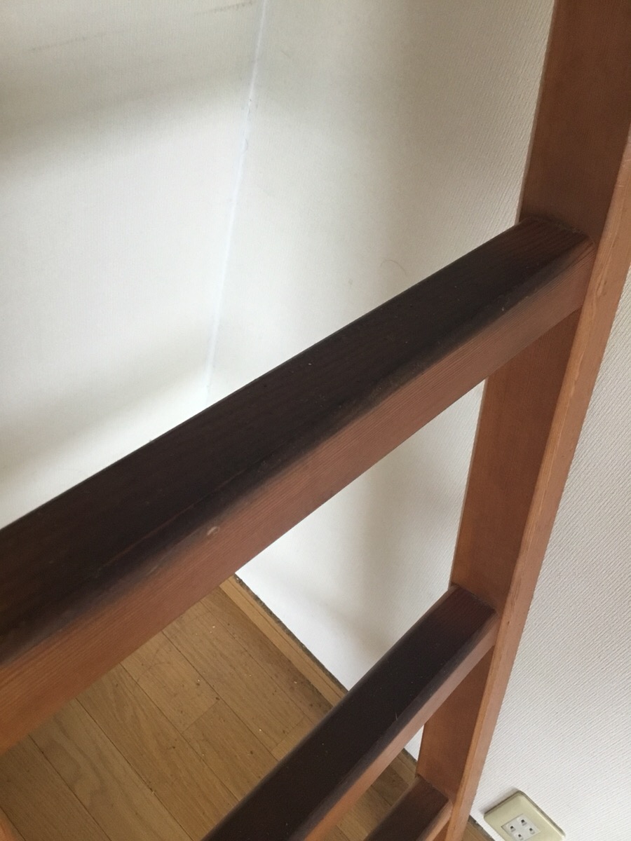 上記写真、ベッドへ上がるはしご。黒くべとべとしてしまってましたが