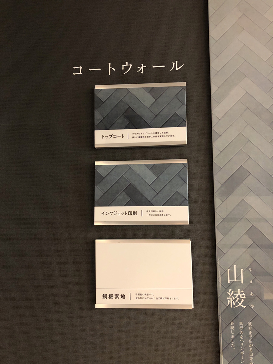 これはユニットバスの壁パネルの一部を展示しているコーナーですが、縦長に展示しているのはかなり希少。。。イメージがわきやすく、それでいて違いも良くわかります。