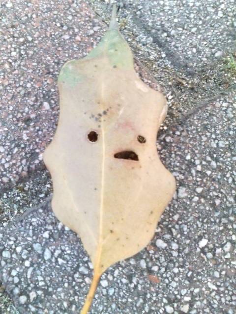 沢山ある落ち葉の中、出会ってしまいました。どことなく悲しそうな顔をした葉っぱです。虫食いがここまで上手くできるのはそうないですね。