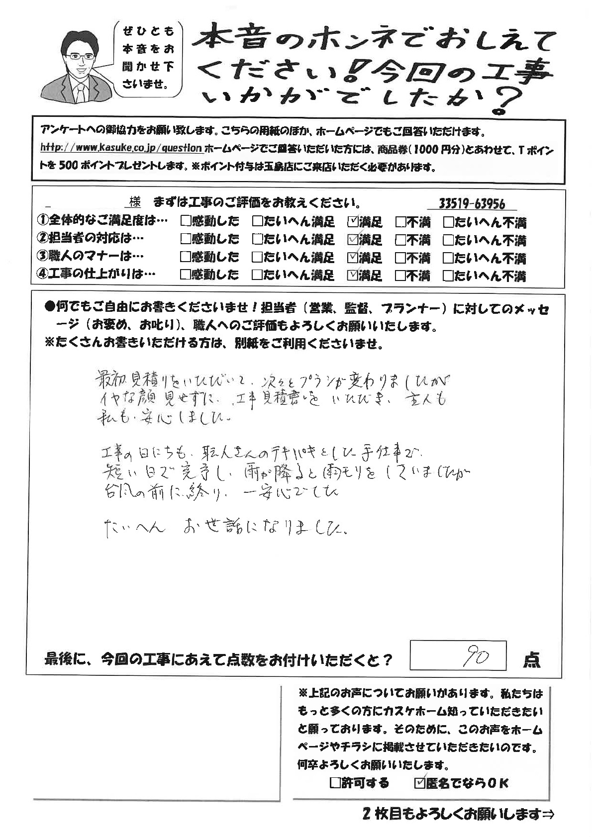 職人さんのテキパキとした手仕事で短い工期で完了し、一安心しました